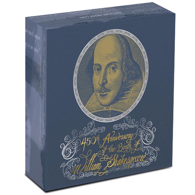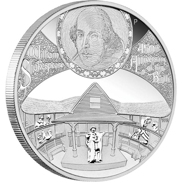 Motivem této stříbrné mince jejíž autorem je designer Wade Robinson, je portrét Williama Shakespeara, jemná prezentace divadla Globe znázorňující nejznámější scény divadelních her Hamlet, Macbeth, Romeo a Julie. Společně s nápisy "William Shakespeare" a "450th Anniversary of his Birth" tradiční značka mincovny Perth Mint "P".
