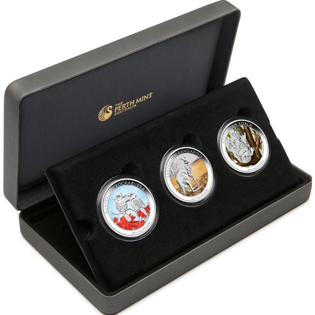 výrobce The Perth Mint (Austrálie); provedení Specimen Quality 99.9% ryzího stříbra; kolorovaný klokan, ledňáček a koala - největší ikony australské fauny; Australské zákonné platidlo