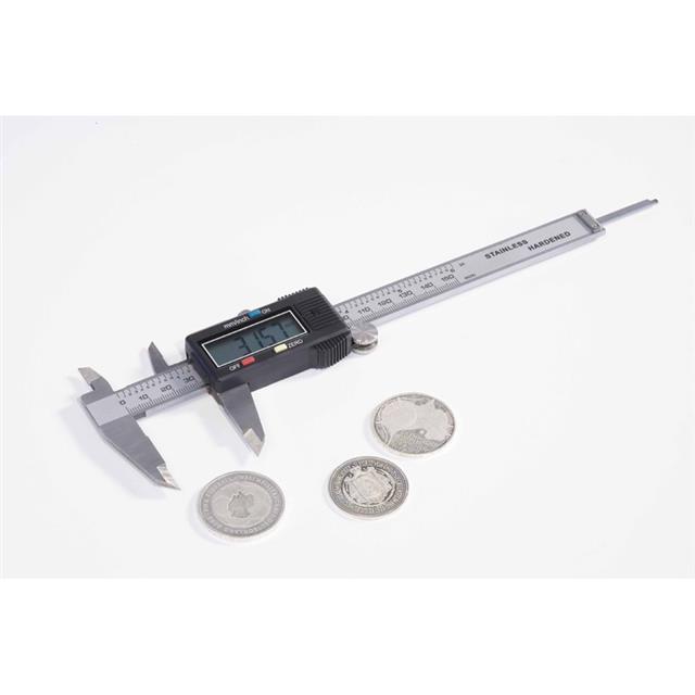 Digitální posuvné měřítko (šuplera) s rozsahem 0 - 150 mm, s kolečkem a hloubkoměrem. Možnost měření rozdílů (nulování kdykoliv), 3 tlačítka, aretační šroubek, přepínání mezi milimetry (mm) a palci (inch), 6-místný LCD diplej, přesnost 1/100 mm. Dodáváno v pouzdře včetně baterie.