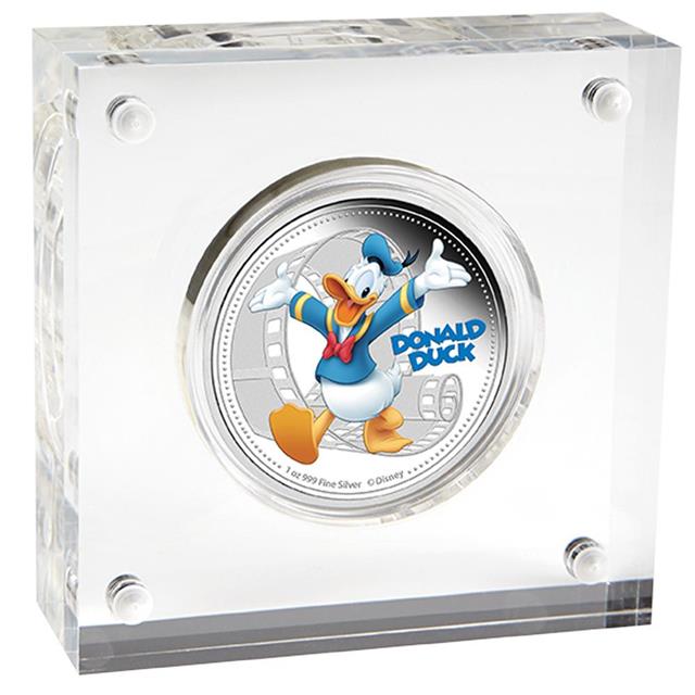 Motivem této stříbrné mince je kačer Donald. Rub mince zdobí podobizna Jejího Veličenstva královny Alžběty II od Ian Rank-Broadley.