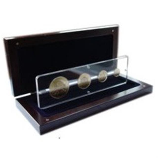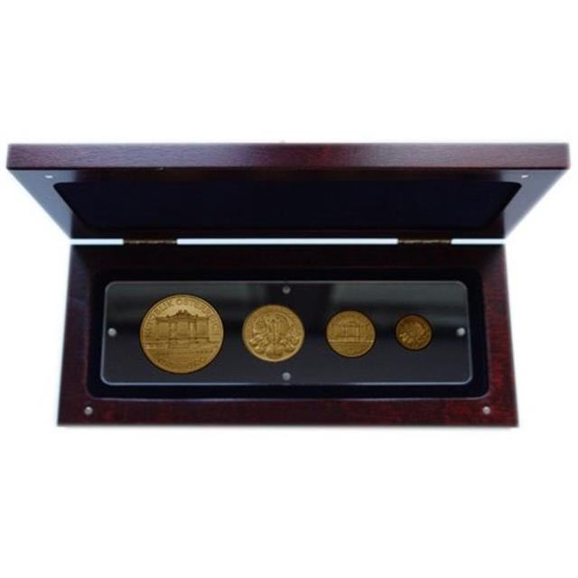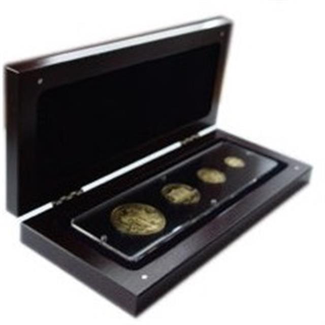 Reprezentativní dřevěná etue pro zlaté investiční mince. Provedení mahagon, modré čalounění, magnetický zámek dovoz Rakousko