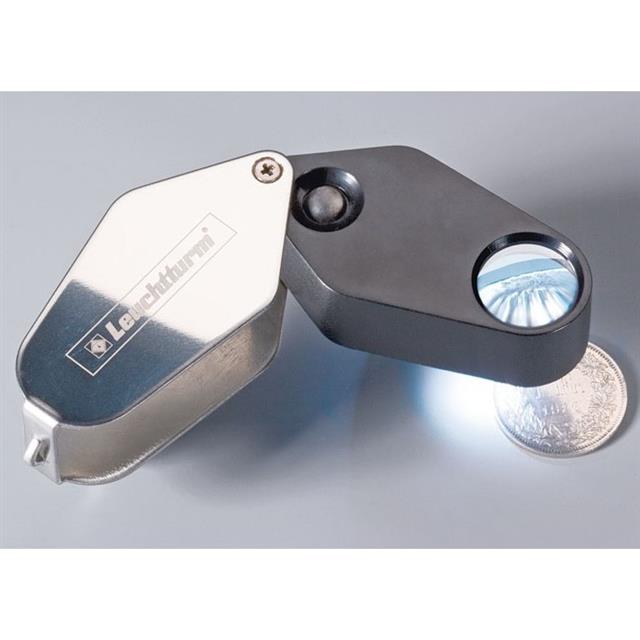 Precizní skládací lupa v klenotnické kvalitě. Zvětšení 10x. Skleněná čočka, 1 LED dioda. Držadlo z kovu.