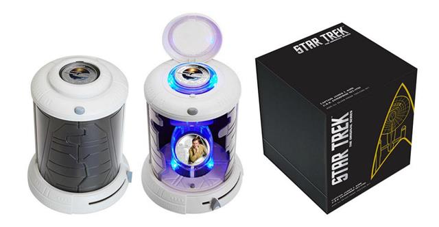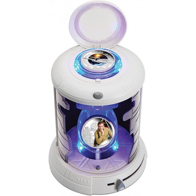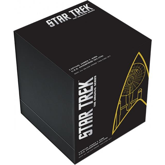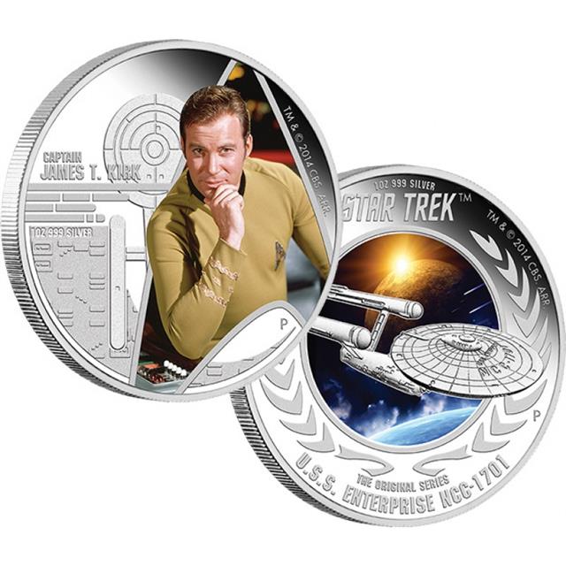 Australská mincovna Perth Mint Vám představuje unikátní sadu dvou stříbrných mincí věnovanou seriálu Star Trek . Motivem mincí z této série je kapitán James T.Kirk ( herec William Shatner) a vesmírná loď USS Enterprise NCC-1701. Mince jsou kolorované z ryzího stříbra 999/1000, 1 oz, v kvalitě Proof a jsou uloženy v originálním obalu, jehož vzhled byl inspirován Star Trek transportérem. Po otevření víka se modré části okolo mincí rozsvítí.