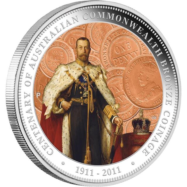 Tato velkolepá stříbrná pamětní mince byla vyražena při příležitosti 100 let ražby mincí společenství Austrálie. První penny a půlpence byly vyraženyy v roce 1911 královskou mincovnou v Anglii. Na líci je zobrazena podobizna krále Jiřího V. (od Sir EB Mackennala), který vystoupal na trůn na smrti jeho otce, krále Edwarda VII dne 6.5.1910.