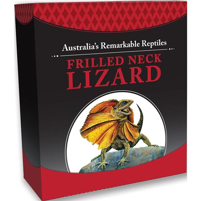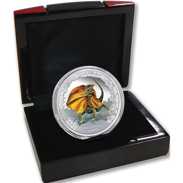 Na líci této mince je vyobrazena Agama límcová spolu s nápisy "Frilled Neck Lizard".