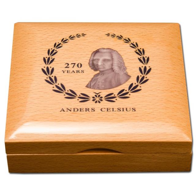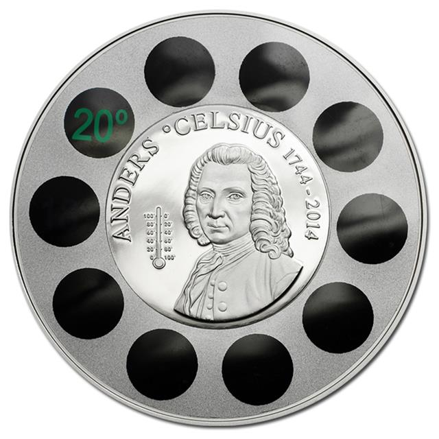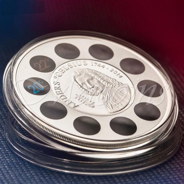 Představujeme Vám unikátní, krásnou, stříbrnou minci věnovanou Andersu Celsiusovi ( výročí úmrtí 270 let), který v roce 1742 definoval teplotní stupnici stupňů Celsia. Mince má skutečný pracovní teploměr se stupnicí 14 až 32 stupňů Celsia.
