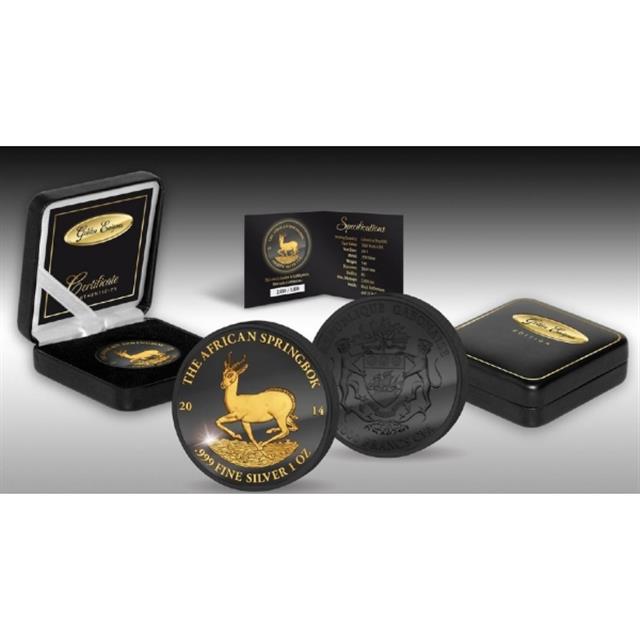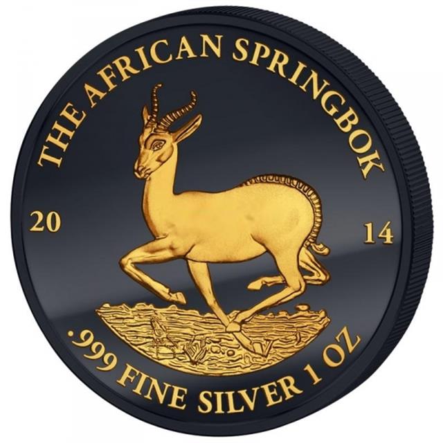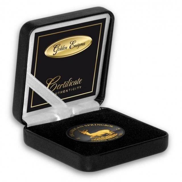Tato krásná stříbrná mince představuje zlacenou Antilopu skákavou (The African Springbok) ze série Golden Enigma ( Zlatá Enigma ) 1 oz 2014. Je již třetí mincí z této krásné série. Mince je kompletně pokrytá vzácným kovem rutheniem a částečně ryzím zlatem. To vše v luxusním dárkovém obalu spolu s certifikátem pravosti je ideálním dárkem, a po celém světě vyhledávaným sběratelským kouskem.