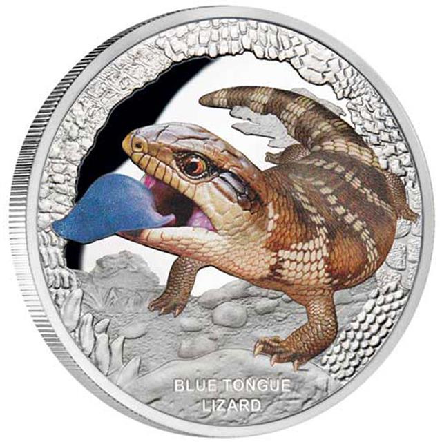 Na rubu této mince je znázorněna Australská modrojazyčná tiliqua - ještěrka, spolu s nápisy "Blue Tongue Lizard".