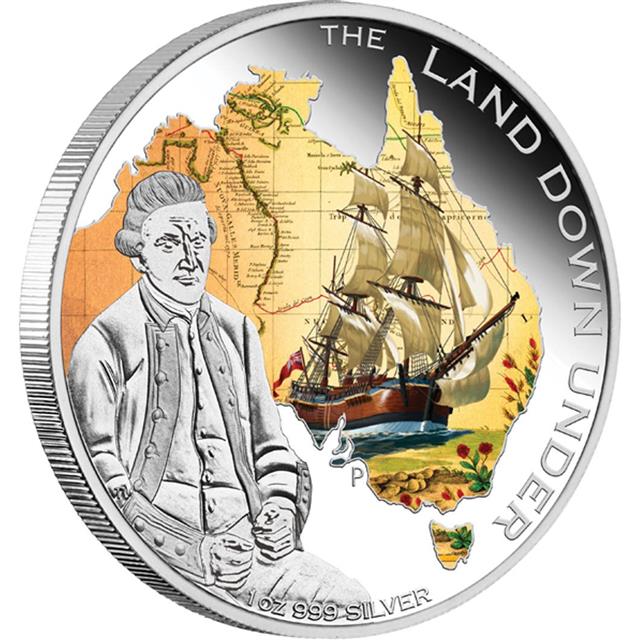 Líc mince zobrazuje portrét sedícího kapitána Jamese Cooka a HMS bárky Endeavour, zasazena do mapy tvaru Austrálie v latexové fólii, ohraničena nápisem LAND DOWN UNDER. Na rubu portrét královny Alžběty II a rok ražby . Mince je vydána jako australské zákonné platidlo s nominální hodnotou 1 AUD.