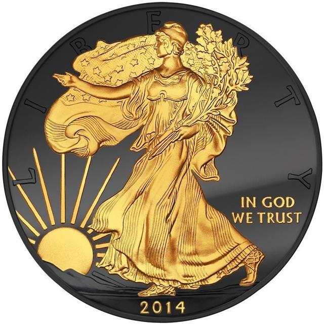 Líc mince zobrazuje zlacenou kráčející bohyni svobody na stříbrné minci potažené rutheniem, Zlacený nápis "In god we trust" ( Věříme v boha). Na rubu mince je zobrazen orel mořský bělohlavý. Designer John Mercanti.