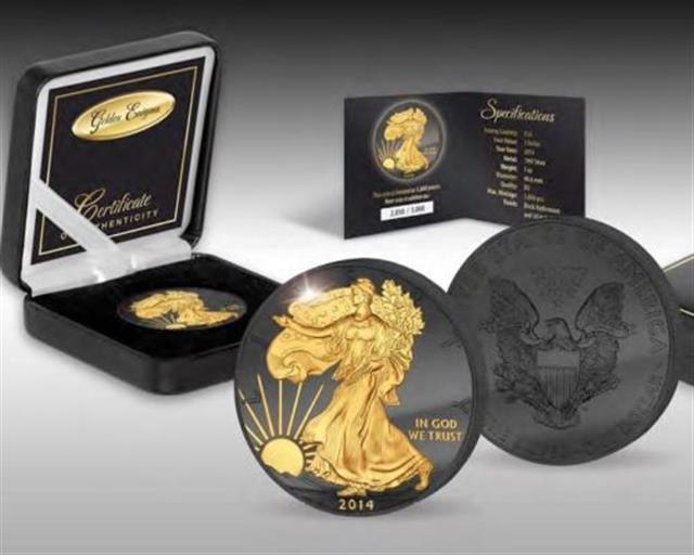 Tato krásná stříbrná mince představuje zlacenou Kráčející Liberty ze série Golden Enigma ( Zlatá Enigma ) 1 oz 2014. Mince je kompletně pokrytá vzácným kovem rutheniem a částečně ryzím zlatem. To vše v luxusním dárkovém obalu spolu s certifikátem pravosti je ideálním dárkem, a po celém světě vyhledávaným sběratelským kouskem.