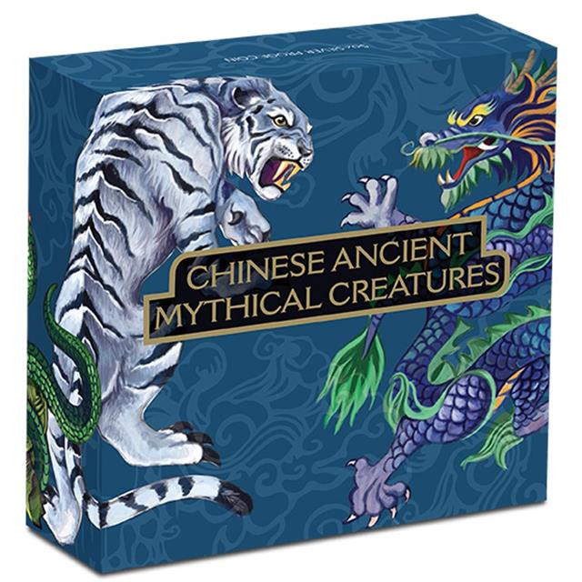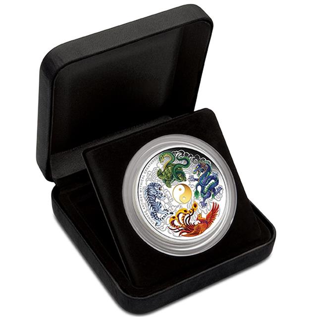 Motivem této mince jsou čínské starověké mytické bytosti. Střed mince zdobí symbol Jin Jang pozlacený 24ct zlatem. Jin a Jang jsou dvě navzájem opačné a doplňující se síly, energie které se nacházejí v každé živé i neživé části vesmíru. Okolo tohoto symbolu jsou zobrazena čtyři nebeská zvířata. Drak (Zelený drak) bydlí na východě a je vyjádřením „jang“. Představuje štěstí a blahobyt, moudrost a stabilitu. Tygr (Bílý tygr) bydlí na západě a je vyjádřením „jin“. Představuje přírodní síly a jejich hrozby, nevypočitatelnost a je proto považován za dobrého ochránce domu či zahrady. Želva (Černá želva) bydlí na severu a je vyjádřením vody, dlouhověkosti a zimy. Představuje naprosté bezpečí a stabilitu. Fénix (Červený fénix) bydlí na jihu a je vyjádřením ohně, léta a volného prostoru. Pátrá v krajině po nebezpečí.