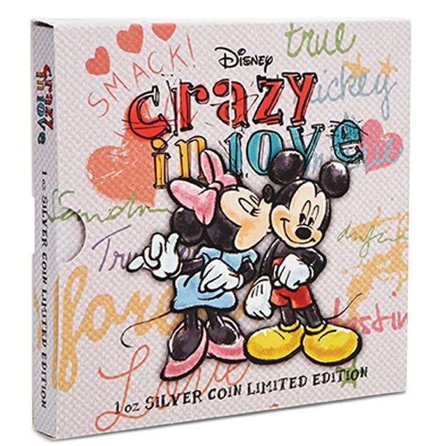 Motivem této stříbrné mince je myšák Mickey a myška Minnie. Rub mince zdobí podobizna Jejího Veličenstva královny Alžběty II od Ian Rank-Broadley.