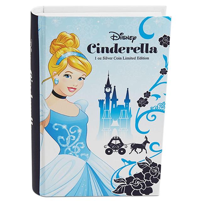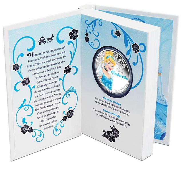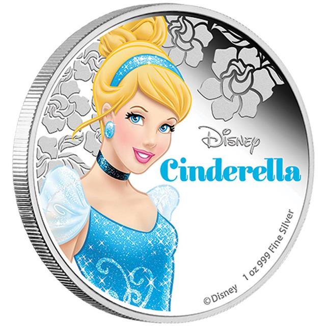 Motivem této stříbrné mince je kolorovaný obrázek Popelky obklopené rytými květy, nápis Disney Cinderella. Rub mince zdobí podobizna Jejího Veličenstva královny Alžběty II od Ian Rank-Broadley.