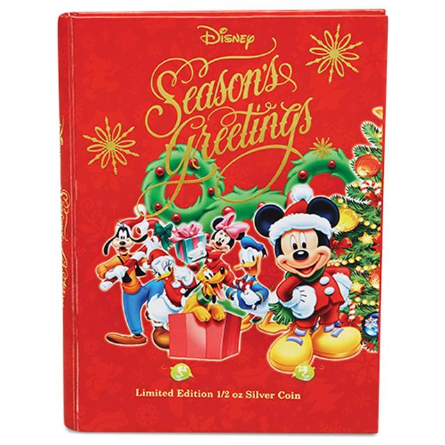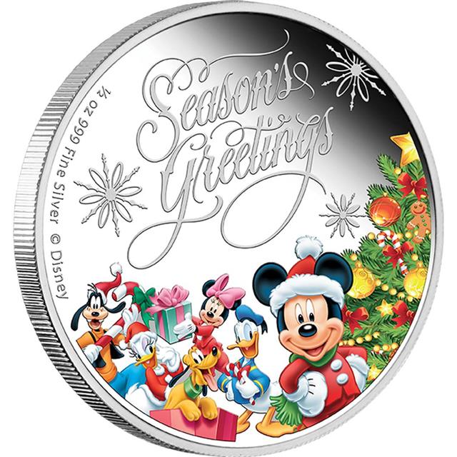 Motivem této stříbrné mince jsou kolorované Disney postavičky u Vánočního stromečku, nápis SEASON'S GREETINGS. Rub mince zdobí podobizna Jejího Veličenstva královny Alžběty II od Ian Rank-Broadley.