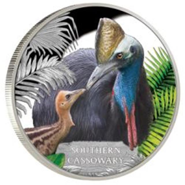 Líc: Kolorovaný Kasuár přílbový s mládětem; Rub: královna Alžběta II |
