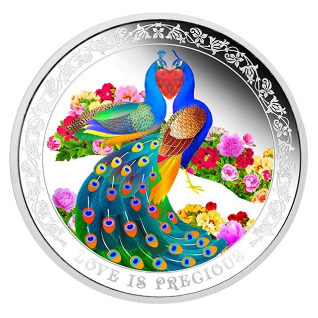 Motivem této krásné kolorované stříbrné mince je párek pávů stojících vedle sebe a mezi jejich krky je umístěno červené srdce ze zirkonu. Na rubu portrét královny Alžběty II. Mince je uložena v originální dárkové krabičce tvaru srdce.