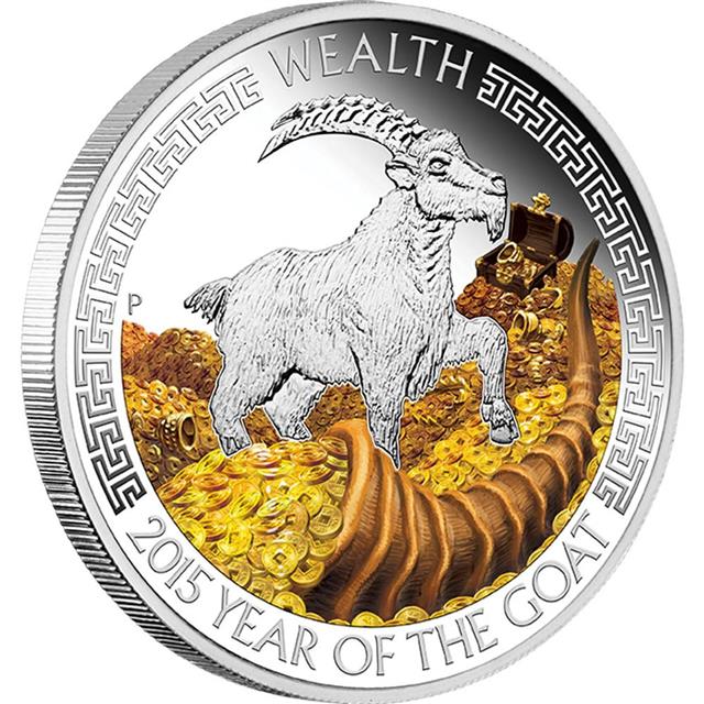 Australská mincovna Perth Mint Vám představuje kolorovanou stříbrnou minci Lunar Good Fortune Rok Kozy 2015 (Year of the Goat) 1oz Proof . Motivem této mince je koza ( Rok kozy 2015 dle čínského lunárního kalendáře), stojící na hromadě zlatých mincí, jenž se sypou z rohu hojnosti.