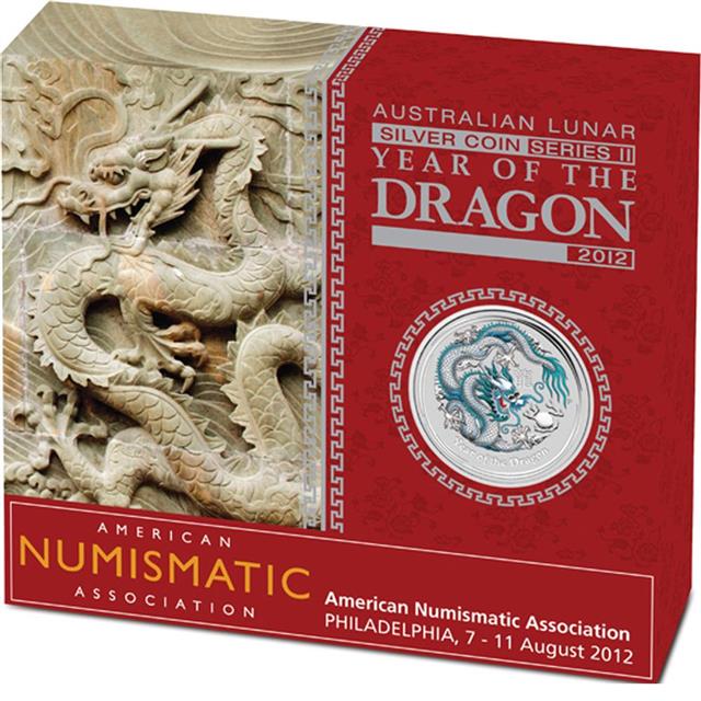 Stříbrná mince Lunární Série II - Rok Draka 2012 - 1 OZ (Austrálie) kolorovaná edice ANA COIN SHOW SPECIAL