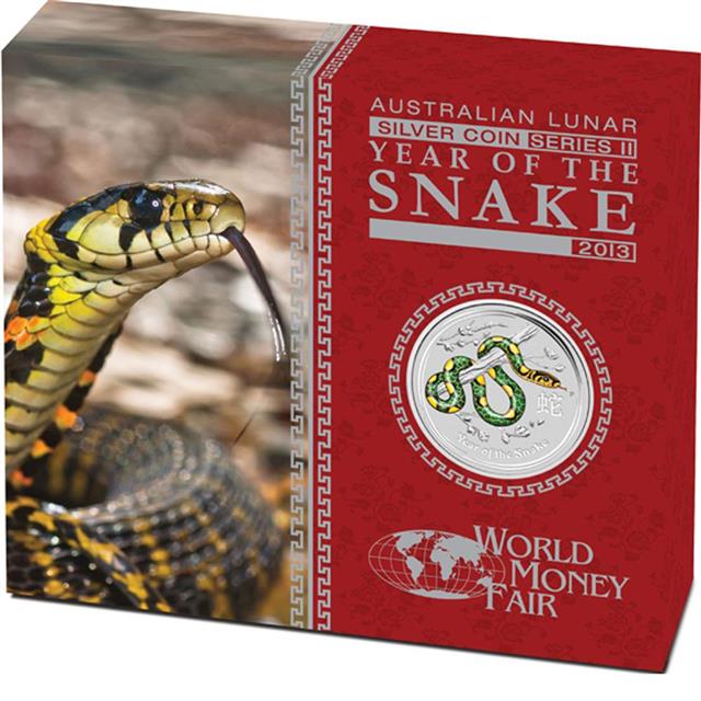 výrobce The Perth Mint (Austrálie); provedení Specimen Quality 99.9% ryzího stříbra; kolorovaný symbol čínského lunárního kalendáře - had - 2013; Australské zákonné platidlo Limitovaná edice - 5 000 kusů; dodáváno v originální dárkové červenočerné krabičce spolu s číslovaným certifikátem pravostiV roce 2013 vydává The Perth Mint další minci mezinárodně uznávané australské Lunární Série II oslavující rok hada, šesté zvíře čínského zvěrokruhu. Brilantní design této 1 Oz stříbrná mince s motivem hada v nádherném barevném provedení symbolizuje štěstí a prosperitu.