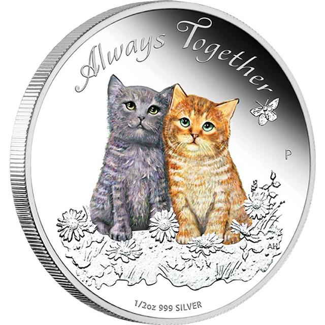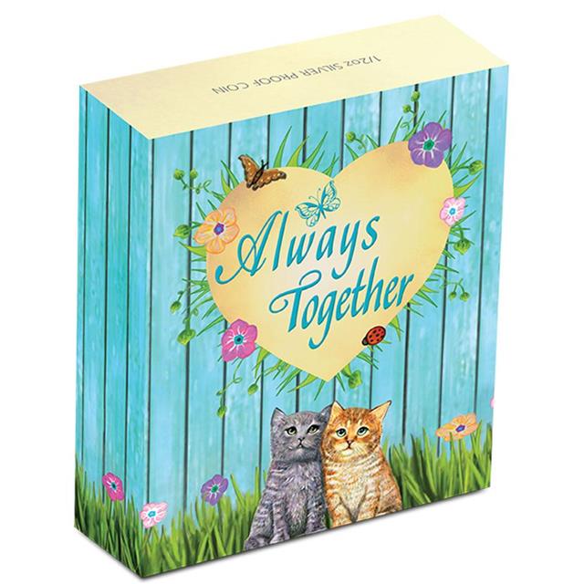 Motivem této krásné kolorované stříbrné mince jsou dvě kočky (koťátka) sedící vedle sebe na louce plné květin a nad hlavou jim letí motýl. Mince je uložena v nádherné ilustrované krabičce s motimvem srdce.