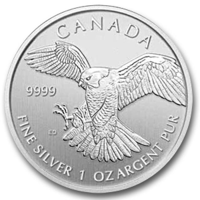 Motivem této mince je Sokol stěhovavý v letu, spolu s nápisem "CANADA FINE SILVER 1OZ ARGENT PUR". Na rubu portrét královny Alžběty II rok ražby a nominální hodnouta 5 CAD. Všechny mince ze série jsou vhodné jako sběratelský předmět a investice.