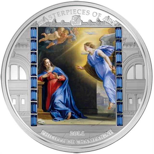 Představujeme Vám další velkolepé mistrovské dílo vyobrazené na stříbrné minci. Nádherná stříbrná, kolorovaná mince s motivem obrazu od barokního malíře Philippa de Champaigne: Zvěstování, zdobená 16ti modrými kameny Swarovski. Mince balena v dárkovém obalu spolu s certifikátem pravosti je ideálním dárkem, a po celém světě vyhledávaným sběratelským kouskem.