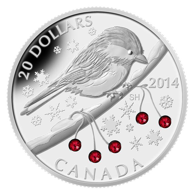 Tato zajímavá stříbrná mince je nádherným dárkem či investicí uloženou v překrásném obalu. Na lícové straně mince je znázorněna malá sýkorka ( Poecile atricapillus) sedící na větvičce a kolem ní padají sněhové vločky. Mince je zdobena pěti červenými krystaly Swarovski, které připomínají červené zimní plody stromu.Spolu s nápisem CANADA rokem ražby a nominální hodnotou. Rub mince zdobí podobizna Jejího Veličenstva královny Alžběty II.