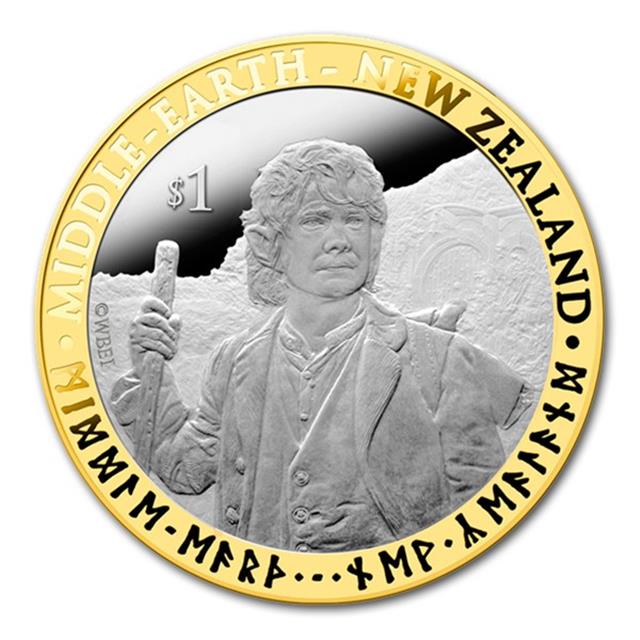 Stříbrná pamětní mince The Hobbit: An Unexpected Journey Brilliant Uncirculated Coin - pozlacená. Na minci je vyobrazen Bilbo Pytlík (Bilbo Baggins) spolu s nápisem v angličtině a hobitštině: Středozem - Nový Zéland. Na lícní straně je královna Elizabeth II. Mince je vydána ke stejnojmennému filmu Petera Jacksona, natočenému podle románu Hobit od J. R. R. Tolkiena.