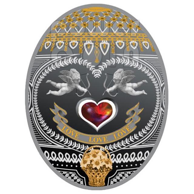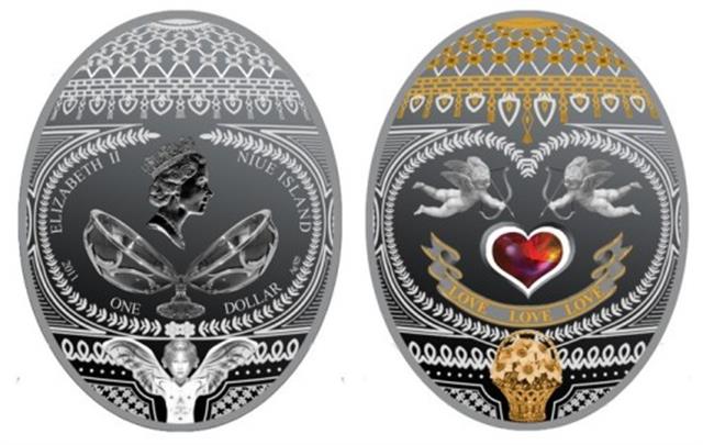 Líc: symboly lásky, rudé zirkové srdce. Rub: královna Alžběta II a otevřené vejce Faberge. |