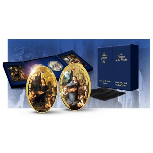 Představujeme Vám dvě mistrovská díla na velkolepých stříbrných mincích. Nádherné stříbrné mince pokryté zlatem s motivem od Leonarda da Vinci: Madona ve skalách, zdobené drahými kameny safírem a rubínem. Komplet je věnován proslulému uměleckému dílu Leonarda da Vinciho – obrazu Madona ve skalách, který da Vinci vytvořil ve dvou verzích. Obraz byl namalován ve dvou různých verzích a každý exemplář této sady představuje jednu z nich. Obě verze jsou si navzájem velmi podobné, ale zároveň nesou zásadní odlišnosti. Numismaty jsou vrcholem mincovního umění. Byly zpracovány v nejvyšší mincovní kvalitě a raženy speciálním razidlem.