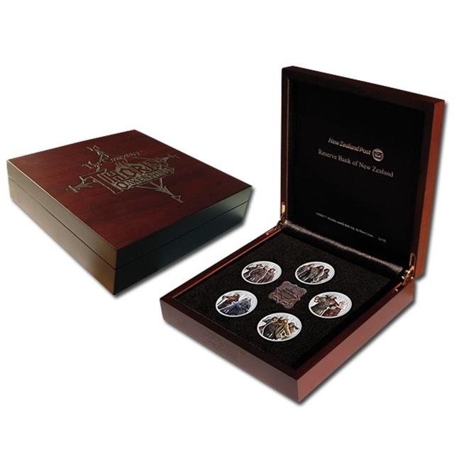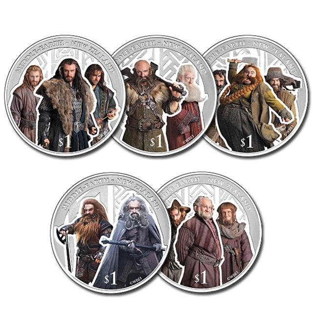 Sada stříbrných sběratelských mincí The Hobbit: "The Desolation of Smaug Silver Coin Set". Na mincích je vyobrazeno všech 13 trpaslíků. Thorin Pavéza, Dwalin, Balin, Fili, Kili, Dori, Nori, Ori, oin, Glóin, Bifur, Bofur a Bombur, spolu s nápisem v angličtině a hobitštině: Středozem - Nový Zéland. Na lícní straně je královna Elizabeth II od Ian Rank - Broadley.