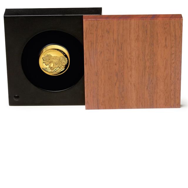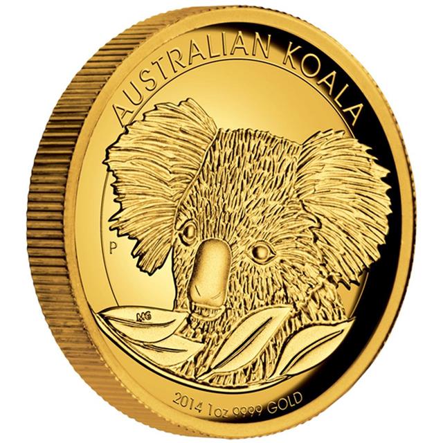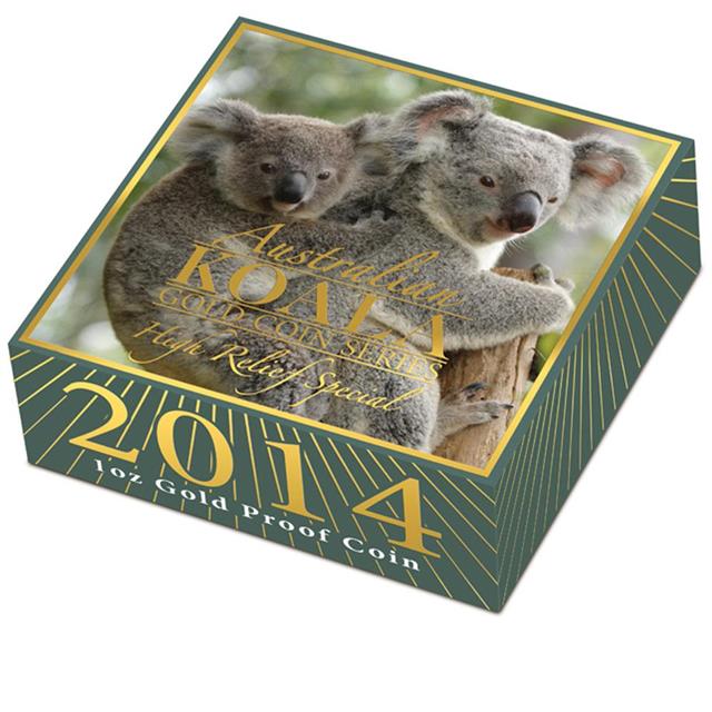 Krásná zlatá mince Koala 2014 1 oz Proof Hight Relief Coin Series. Autorem mince je Michael Guilfoyle. Mince s hlubokou ražbou se zvýrazněním detailu.