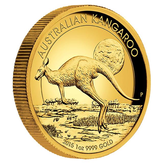 Krásná zlatá mince Australský klokan (Australian Kangaroo) 2015 - 1oz Gold Proof High Relief. Autorem mince je Wade Robinson. Mince s hlubokou ražbou se zvýrazněním detailu.