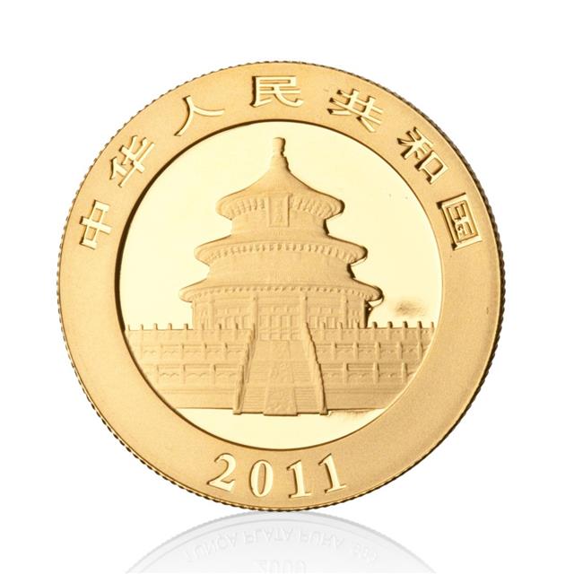 Čínské Pandy jsou raženy z 24 karátového zlata od roku 1982 a přes mírně vyšší cenu si získaly přízeň investorů, ale i sběratelů. A to především proto, že každý rok mění vzhled svého rubu, který je věnován tématu ohroženého medvídka. Na líci je modlitebna boha úrody v Nebeském chrámu v Pekingu (Tien Tien) a text v čínských znacích znamená "Čínská lidová republika". Pandy jsou raženy v pěti velikostech odvozených od hmotnosti 1 unce (nominál 500 Yuan), 1/2 unce (200 Yuan), 1/4 unce (100 Yuan), 1/10 unce (50 Yuan) a 1/20 unce (25 Yuan). Garantem ryzosti je emitující stát.