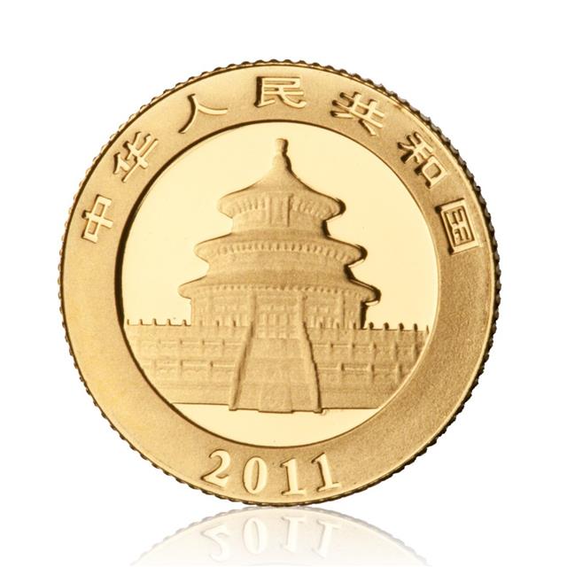 Čínské Pandy jsou raženy z 24 karátového zlata od roku 1982 a přes mírně vyšší cenu si získaly přízeň investorů, ale i sběratelů. A to především proto, že každý rok mění vzhled svého rubu, který je věnován tématu ohroženého medvídka. Na líci je modlitebna boha úrody v Nebeském chrámu v Pekingu (Tien Tien) a text v čínských znacích znamená "Čínská lidová republika". Pandy jsou raženy v pěti velikostech odvozených od hmotnosti 1 unce (nominál 500 Yuan), 1/2 unce (200 Yuan), 1/4 unce (100 Yuan), 1/10 unce (50 Yuan) a 1/20 unce (25 Yuan). Garantem ryzosti je emitující stát.