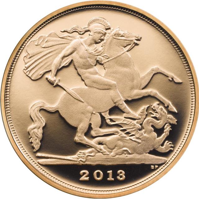 Motiv averzní strany zaujímá portrét královny Alžběty s latinským opisem. Na reverzní straně je vyobrazen sv. Jiří bojující s drakem, u dolního okraje je umístěn rok vydání 2013.