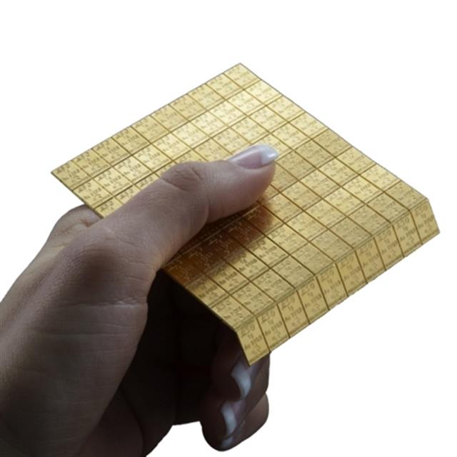 Švýcarské zlaté slitky z 24 karátového zlata, certifikované švýcarskou firmou Valcambi SA odpovídají londýnskému standardu Good Delivery a jsou proto bez problémů akceptovány na všech trzích. Plato je členěné na jednogramové slitky, z nichž každý má svůj punc a dá se snadno oddělit.