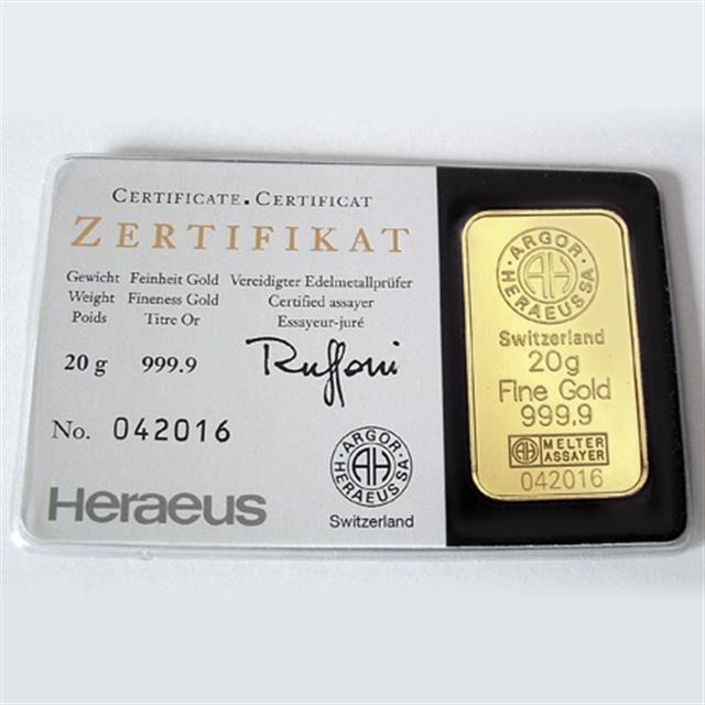 Švýcarské zlaté slitky z 24 karátového zlata, certifikované švýcarskou firmou Argor-Heraeus SA odpovídají londýnskému standardu Good Delivery a jsou proto bez problémů akceptovány na všech trzích. Na zadní straně jsou opatřeny prvkem se zvýšeným zabezpečením - Kinegramem.