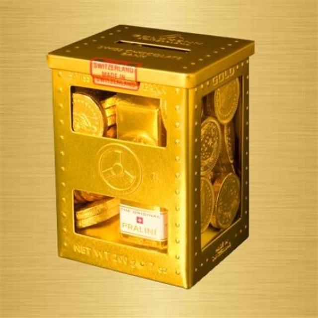 Nápaditě zpracovaný zlatý trezor z jemného plechu plněný chutnou švýcarskou mléčnou čokoládou. Vychutnejte i Vy kvalitní čokoládu ze Švýcarska s příchutí " pravého zlata"